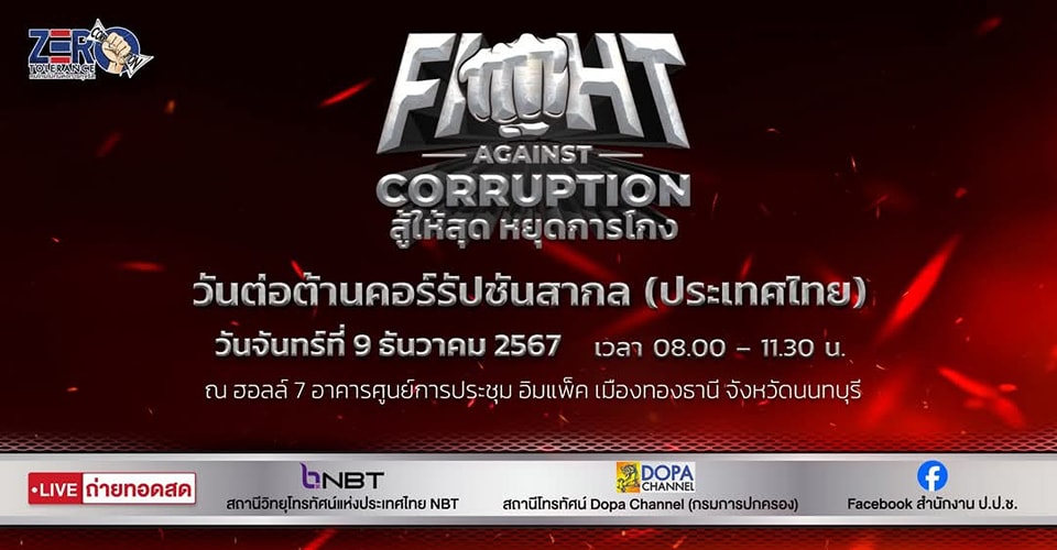 ร่วมแสดงพลัง Fight Against Corruption “สู้ให้สุด หยุดการโกง” พร้อมกัน ในวันต่อต้านคอร์รัปชันสากล (ประเทศไทย) วันจันทร์ที่ 9 ธันวาคม 2567 เวลา 08.00 – 11.30 น. ณ ฮอลล์ 7 อาคารศูนย์การประชุม อิมแพ็ค เมืองทองธานี จังหวัดนนทบุรี