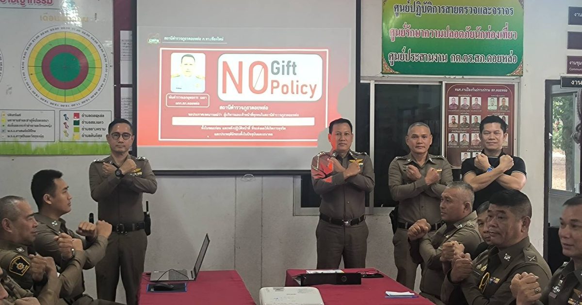 พ.ต.อ.ยุทธการ เมธา ผกก.สภ.ดอยหล่อ , พ.ต.ท.กฤตมนูสิน สุรินรังษี รอง ผกก.ป.ฯ , พ.ต.ท.วิษณุ บุญมา รอง ผกก.สส.ฯ พร้อมข้าราชการตำรวจ สภ.ดอยหล่อ ร่วมประชุมประจำเดือน ชี้แจงข้อราชการ และมอบนโยบายจากผู้บังคับบัญชา การประกาศนโยบายการไม่รับสิ่งของหรือสิ่งตอบแทน No Gift Policy