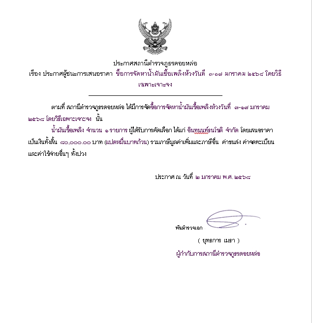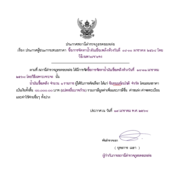 ประกาศสถานีตำรวจภูธรดอยหล่อ เรื่อง ประกาศผู้ชนะการเสนอราคา ซื้อน้ำมันเชื้อเพลิง